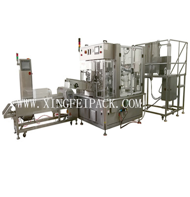 包装流程(工位分布):1)上袋—2)色带(喷码)打码(选项)—3)开自立袋底—4)开袋口—5)一次充填—6)二次充填(选项或者备用)—7)热封口(同时排气)—8)冷封口和产品输出。