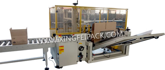 本机将叠成纸板的箱子自动打开,箱子底部按一定程序折合,并用胶带密封,可单独使用,也可与装箱机连线使用。广泛应用于食品,化工,日用品等行业。