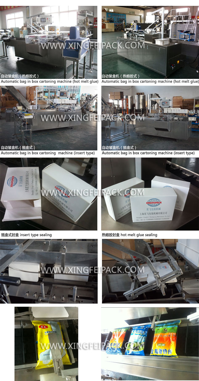 本机适用于袋装产品的包装,能自动完成袋子输送,纸盒供应,打开,袋子装盒,封盒等工作。有两种封盒形式可供选择:插盒,热熔胶。